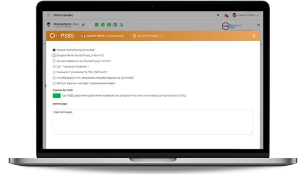 Mit Hilfe des Schmerzprotokolls, des Knackprotokolls und des Limitationsprotokolls, sowie spezifischen Patient:innen-Befunden erhalten Sie die perfekte Unterstützung Ihrer CMD-Behandlung. Ein „Beiblatt“ unterstützt die Abrechnung bei PKV- und Beihilfe-Patient:innen. Zusätzlich stehen den Praxen Aufklärungsformulare zur medizinischen/forensischen Notwendigkeit einer Funktionsanalyse vor Kieferorthopädie und Prothetik sowie individuelle Kostenaufklärungsformulare zur Verfügung.